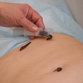 Две пиявки в пупок. Именно такую первую постановку рекомендует Константин Васильевич Сухов - врач, кандидат медицинских наук, гирудотерапевт с большим практическим стажем. Постановка «убивает сразу двух зайцев». Во-первых, начинается частичная очистка печени - от пупка в печень идет большая (воротная) вена, и вся слюна пиявки попадает сразу в печень. Во-вторых, такая постановка дает возможность оценить количество приставок на ближайшие сеансы. Если кровь текла 3-4 часа - можно ставить 4-5 шт. Если 20-24 часа - пока не более 2-3.